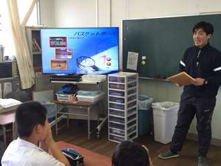 写真はバスケットボールクラブの模様です。クラブ活動でもICTを活用していました。大型テレビにバスケットボールの紹介を映していました。ワクワクしますね。