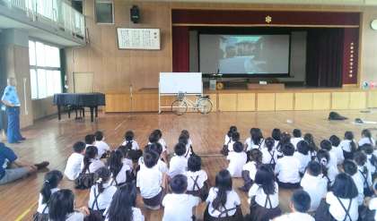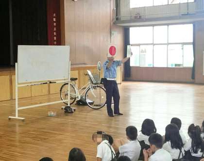 2時間目に、1.2.3年生を対象とした交通安全指導がありました。警察の方に来て頂き、信号の見方や、自転車の走行側、道路を歩く時の注意などを教えて頂きました。自転車は車の仲間です。乗る時には、車道の左側を通らないといけません。自分の命を守る為にも、きちんと交通ルールを守りましょうね。