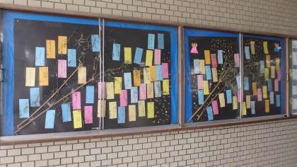 さて、いつもみんなの目を楽しませてくれる学校の掲示板。七月の講堂前の掲示板は6年生による七夕飾りです。一人ひとりが短冊に願いを書きました。将来の夢、勉強のこと、家族や友達のことなど、夢ややさしさがたくさんあふれています。