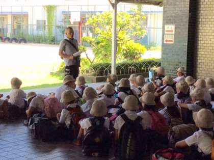 出発式では代表のお友だちが、お見送りのおうちの方や先生たちに林間に向けての意気込みを伝えてくれた。頼もしかった。