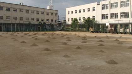 いたずらではありません。この暑い時期、運動会を目指して、校庭の整備も始められています。土を振るい落として、小石を除いていきますが、この小山、実は全部三年生H先生の汗だくの作品です。