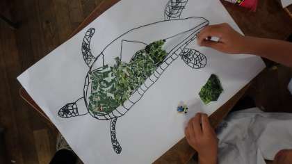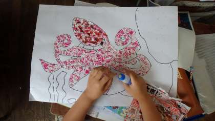 6月12日(月)珍しく、とても涼しい大阪の天気です。今回は、なにやら一生けんめい広告の紙をちぎっていた3年1組におじゃましました。どの子の机の上にも、生き生きと画用紙から抜け出てきそうな海の生き物ができあがりつつあります。