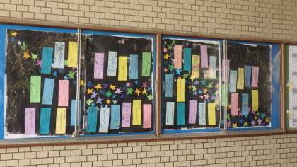 また、ピロティーの掲示版も7月用に衣替えしています。今回は6年生の皆さんの願いのこもった七夕の短冊の掲示です。