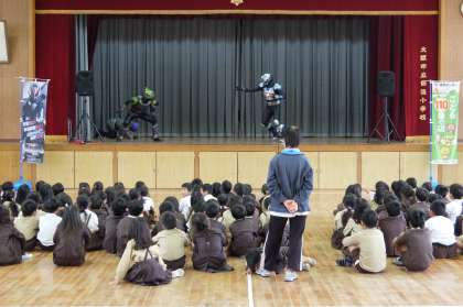 10月20日(金)、午前、此花警察署・読売防犯協会のみなさんに案内されて、≪地球戦士ゼロス≫が伝法小学校に来てくれました。そして世の中の悪(特に連れ去り)からみんなをまもるために、伝法小学校の講堂兼体育館で激しく戦ってくれました。迫力あるバトルに、みんな(1〜3年生)もゼロスを大きな声で応援し続けました。