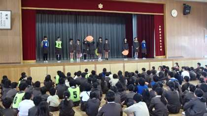 12月14日(木)、寒い日が続きます。児童集会では伝法小学校がずっと取り組んでいる「でんでんポカポカの木」の取組みを広報委員会が発表してくれました。