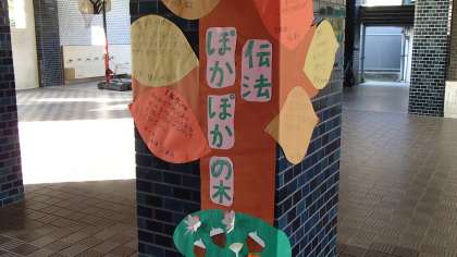 「ポカポカの木」のとりくみは、年3回(学期毎)人や友だちのよいところを見つけて、木の葉っぱや花・実にメッセージとして書きます。『いいとこ見つけ』の形をとる心の教育です。人の良いところに気づくことは、自分の良さを見つけることに繋がります。そこからたくさんの優しさが育ちます。今回は2学期、その中から選ばれた「大きい葉っぱ」バージョンでした。おかげさまです。心はぽっかぽか、いいですね。