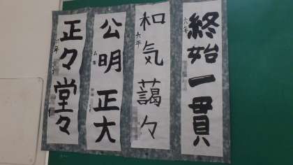 1月18日(木)あたたかくおだやかな一日となりました。校内を歩いていると6年生の掲示版に、書初めが貼ってありました。新年最初の習字の時間、自分の書きたい四字熟語を探してきて書きました。どの文字にもその人の気持ちや人柄がしのばれる素晴らしい作品です。しかし、みんなしっかりとこんな難しい言葉にも、自分の生き方を重ねて考えたり動き出そうとしているのですね。六年生、大きく育ってます。