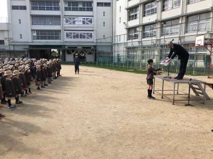 今日は、学校生活1年の終わりの日。修了式では、校長先生から児童代表に修了証が渡されました。子どもたちは、校長先生から、この一年で「あいさつができるようになったこと」など、様々なことをほめてもらいました。