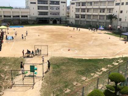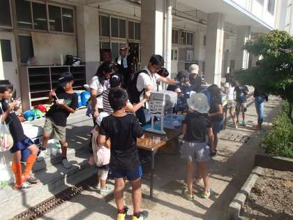 校内グラウンドでは、ストラックアウト・水鉄砲遊び・ミニサッカー・サッカーゴルフなどで遊びました。活動の最後には、かき氷をいただきました。