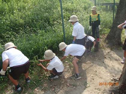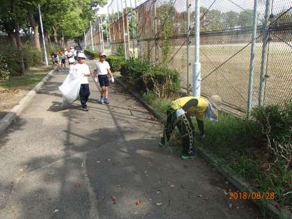 校外グラウンドを清掃中。みんな、一生懸命がんばっています。
