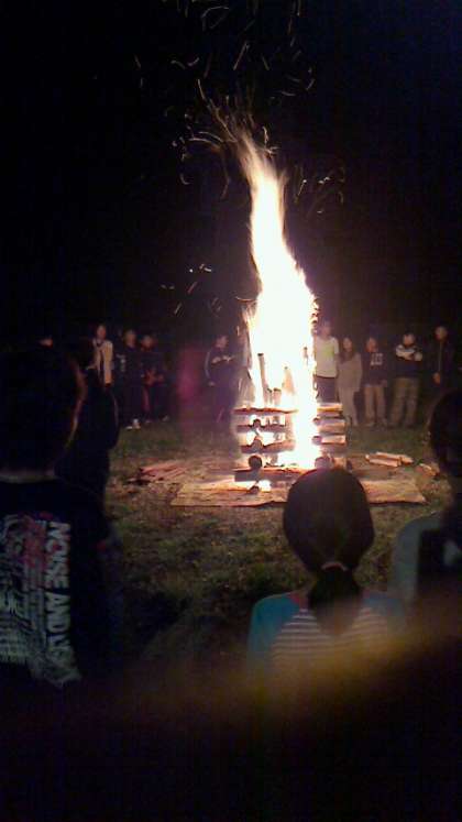 さあ、夕食後はいよいよお楽しみのキャンプファイヤー。火之神の登場後、点火。炎が燃え上がり、キャンプファイヤーのスタートだ でんでん