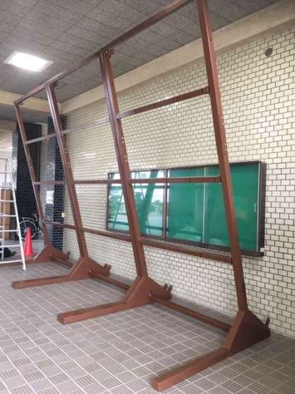 子どもたちが待ちに待った、ボルダリングボードの設置が始まりました。大きなトラックに載せて、たくさんの備品が運ばれてきました。