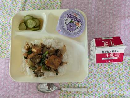 マーボーあつあげ丼、きゅうりの中華あえ、ぶどうゼリー、牛乳