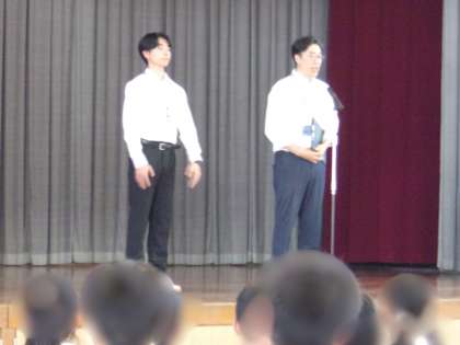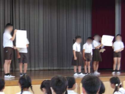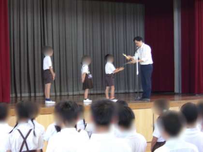 今日の児童朝会は、講堂で行いました。まず校長先生から教育実習生の紹介がありました。次に「あいさつ」についてのお話がありました。ちょうど本日から児童会による「あいさつ運動」も始まります。気持ちの良いあいさつをして、毎日元気に過ごしてほしいと思います。最後に児童の表彰がありました。