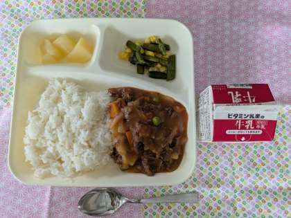 ハヤシライス、グリーンアスパラガスとコーンのサラダ、洋なし(カット缶)、牛乳