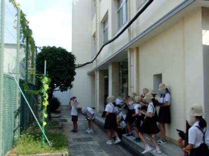 5年生は理科「花から実へ」の学習をしました。東校舎側の防球ネットに弦を伸ばしている「へちま」の観察を行いました。1人1台端末を使って弦や花の様子を写真で記録していました。