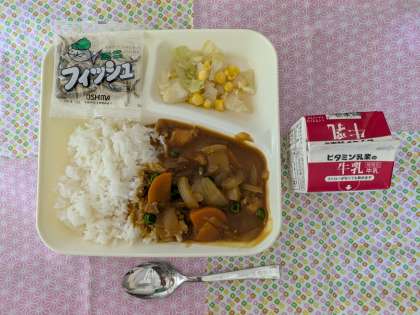 チキンカレーライス、キャベツとコーンのサラダ、ミニフィッシュ、牛乳