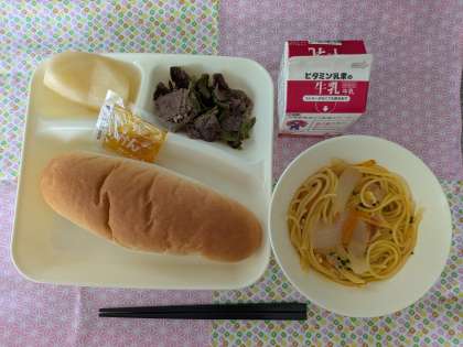 牛肉の香味焼き、トマトのスープスパゲッティ、なし(二十世紀)、コッペパン、みかんジャム、牛乳