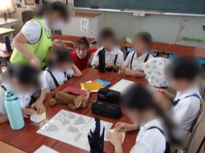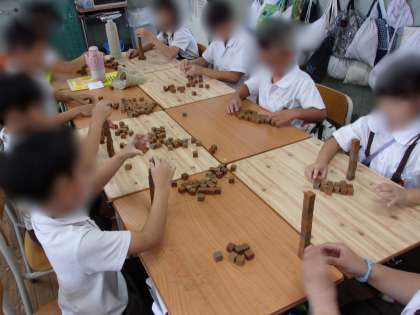 今年のデンリンピックは、「お手玉」「折り紙」「けん玉」「積み木」の4種目です。各教室に移動してルールの説明を聞いてから、それぞれの種目に挑戦しました。