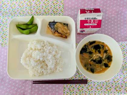 さごしのみぞれかけ、かぼちゃのみそ汁、えだまめ、ごはん、牛乳