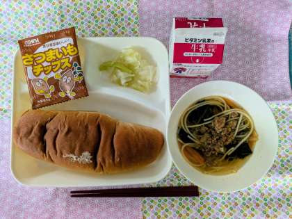 タンタンめん(肉みそ、汁めん)、キャベツの甘酢づけ、おさつチップス、黒糖パン、牛乳