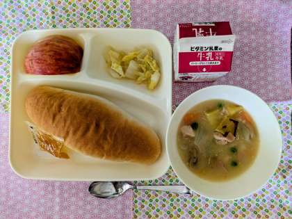 鶏肉とさつまいものシチュー、はくさいのピクルス、りんご、コッペパン、みかんジャム、牛乳