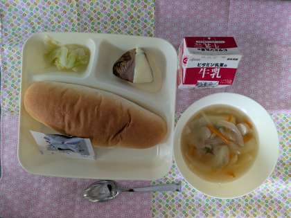 かつおのガーリックソースかけ、ウインナーとじゃがいものスープ、キャベツのサラダ、コッペパン、ブルーベリージャム、牛乳