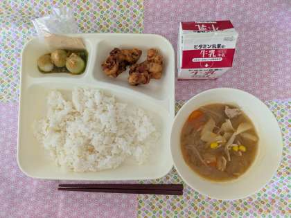 とり天、どさんこ汁、抹茶団子、ごはん、牛乳