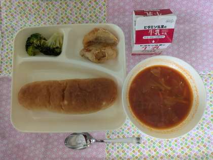 白身魚フリッター、ミネストローネ、ブロッコリーのサラダ、おさつパン、牛乳