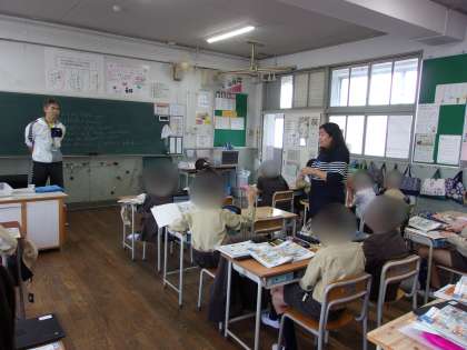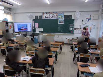5年生は、外国語の学習でした。和気あいあいとした雰囲気の中、C-NETの先生から、伝法小学校の周りには、どのような施設や建物があるのか聞かれ、子どもたちが英語で答えていきました。
