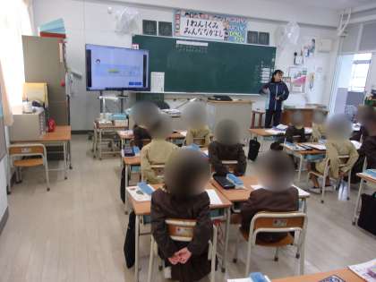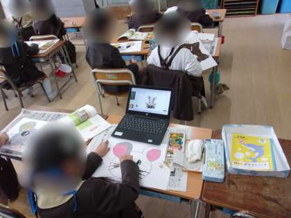 2年生は、国語科「ニャーゴ」の学習です。登場人物の絵を画用紙に大きく描いています。完成した絵がどのように活用されるのか楽しみです。
