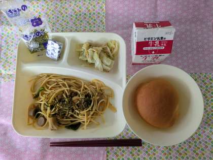 ウインナーときのこの和風スパゲッティ、焼きツナキャベツ、固形チーズ、ミニコッペパン、牛乳