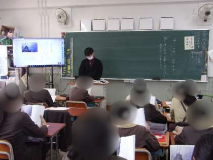 4年生は、「百人一首に親しもう」の学習でした。百人一首に使われている聞きなれない言葉を確認しながら、リズムや響きを楽しんで音読しました。