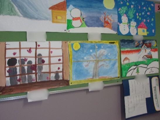 5年生「詩から情景を表現しよう」 タイトルの通り詩から連想する情景を絵で表現します。今回の詩は三好達治の「雪」です。詩を読んで感じたことや想像したことを表現します。自分が感じたことを、絵でどのように表現すればよいのか、しっかりと考えて描くことができました。