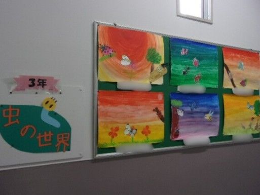 3年生「虫の世界」 蝶々やみつばち、てんとう虫やかまきり等、自分の好きな昆虫を描いて切り取っておきます。背景に森や太陽などの情景をグラデーションを使って表現します。そこに切り取った昆虫たちを貼り付けて、自分なりの虫の世界を表現していました。