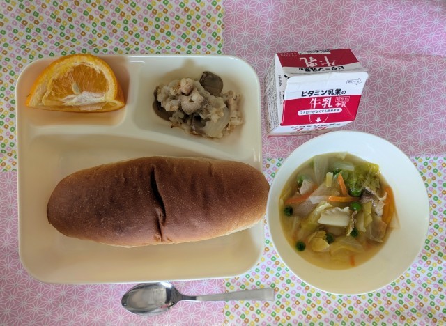 押麦のグラタン、スープ、いよかん、黒糖パン、牛乳