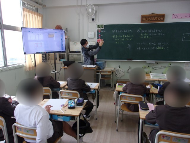 4年生は、算数で、直方体の展開図の学習をしました。直方体の特徴を捉えるとともに、辺の長さや面のつながりなどに着目して方眼紙に展開図をかき、本当に直方体になるのか確かめるために、切り取って組み立ててみました。