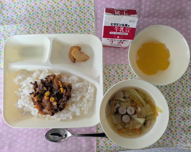 牛肉やたまねぎ、コーン、ピーマンを使った「ビーフケチャップライス(具)」は、ごはんにかけて混ぜて食べました。これに、「フライドポテト」と彩りよく仕上げた「キャベツのスープ」を組み合わせました。デザートは「ダイスゼリー(みかん)」です。「おいしい」と大変好評でした。