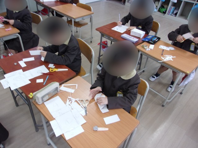 2年生は、算数の学習でした。箱を作るため、画用紙に写し取った面の形を切り取り、同じ長さの辺や向かい合う面などに着目してつなぎ合わせ方を考えます。実際に組み立てていって、箱になるかを確かめました。