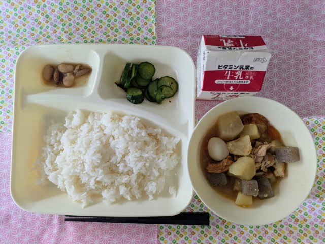 関東煮、きゅうりの梅風味、とら豆の煮もの、ごはん、牛乳
