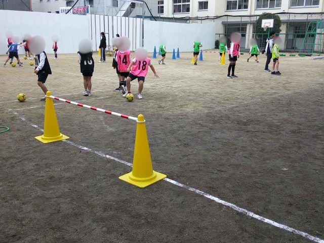 4年生は、体育でサッカーに取り組んでいます。今日は、ペアでパス交換をしながらゴール前までボールを運び、最後にシュートをしたり、円になって円の中で邪魔をする人にボールを取られないようパスを回したりしました。
