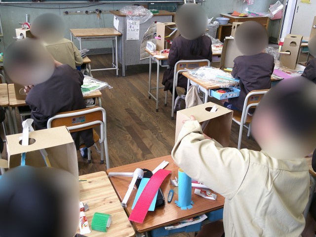 5年生は、図工で立体作品を制作しています。「ビー玉大ぼうけん」ということで、立体の箱に、ビー玉が転がる道を作ります。面白い仕掛けやコースの形状を考えながら、楽しんで取り組みました。