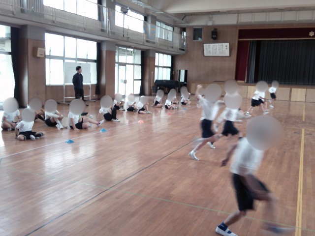 4年生は、講堂で体育の学習でした。最初に鬼ごっこで楽しく体を動かした後は、グループに分かれて、スキップやサイドステップ等、いろいろな走り方に挑戦しました。