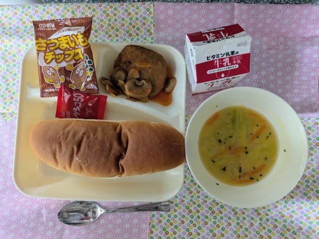 煮込みハンバーグ、コーンスープ、おさつチップス、コッペパン、いちごジャム、牛乳