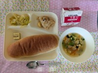 今日の献立鶏肉の塩こうじ焼き、かす汁、くりきんとん、ごはん、牛乳 かす汁は、酒か...