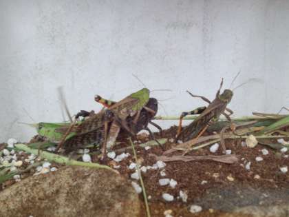 ケースの中は人口密度ならぬバッタ密度が高過ぎて、押し合いへし合い、踏ん付け合いのバッタパラダイスです。