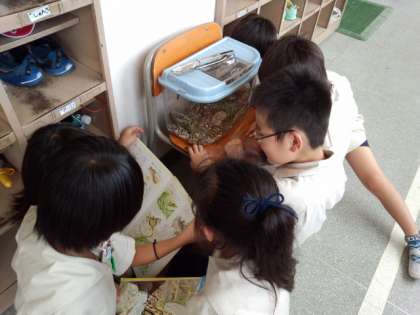 廊下に置かれたケースを取り囲み、早速図書室で借りた図鑑を広げてバッタの名前を調べが始まりました。