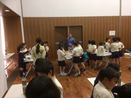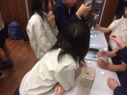 泥水を砂の層に通すと透明な水になりました。色が付いた臭いのする水を活性炭の層を通すと臭いの無い透明な水になりました。「おう〜」と驚きの声が部屋の中にあふれていました。