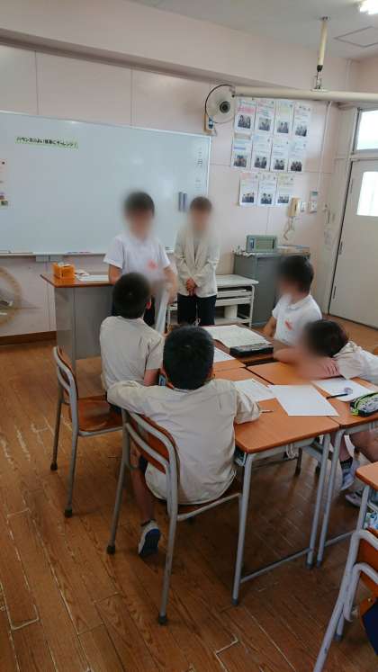 3時間目には、他校より先生に来ていただき、栄養についての学習をしました。グループで食事のメニューを考え、バランスよく食べるにはどうしたらいいかを教わりました。栄養のバランスに気をつけて、自分のメニューを考えることができました。