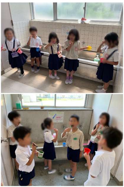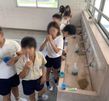 昨日と今日、給食を食べ終えた子どもたちがしっかり歯を磨いていました。